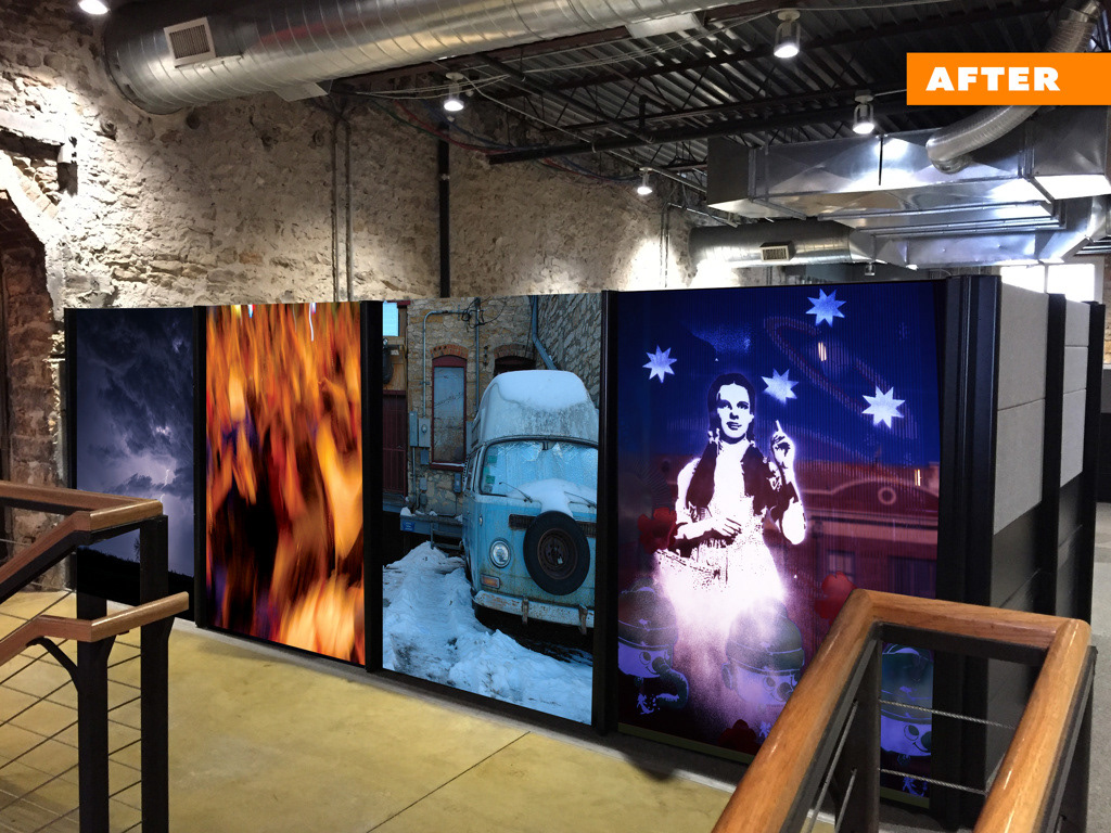 The wall photographs were images I had made of downtown Lawrence during the years. Also included was an image by Jon Hardesty, our agency photographer, of a tree in Topeka at the moment it was struck by lightning. These images were a way for us to bring the outside community into our agency community. Because Callahan Creek was founded in Topeka, Jon’s image was an ideal addition.